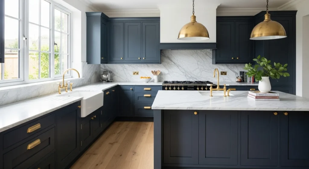 Using deep navy paint on your cabinetry creates an immediate sense of luxury and depth. This darker shade works exceptionally well in larger kitchens where it grounds the space without making it feel too enclosed. When you pair this rich color with bright white countertops, the contrast is striking and keeps the room feeling balanced. The addition of gold or brass hardware acts like jewelry for the room, adding a layer of warmth that prevents the navy from feeling too cold.