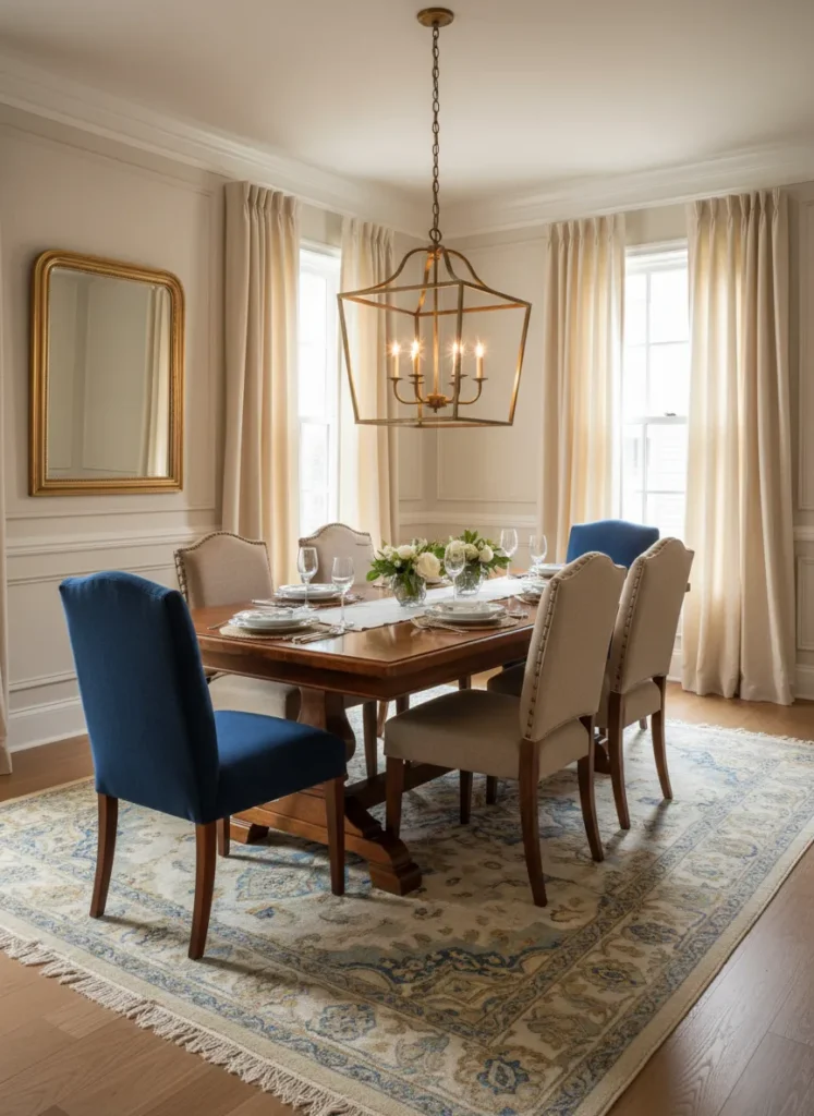 A fabric tiered chandelier adds a layer of softness and tailored elegance to the dining room. These fixtures feature concentric rings of fabric shades that overlap, creating a structured yet delicate look. The fabric texture absorbs sound slightly, which can help dampen noise in a dining room with hard floors.
